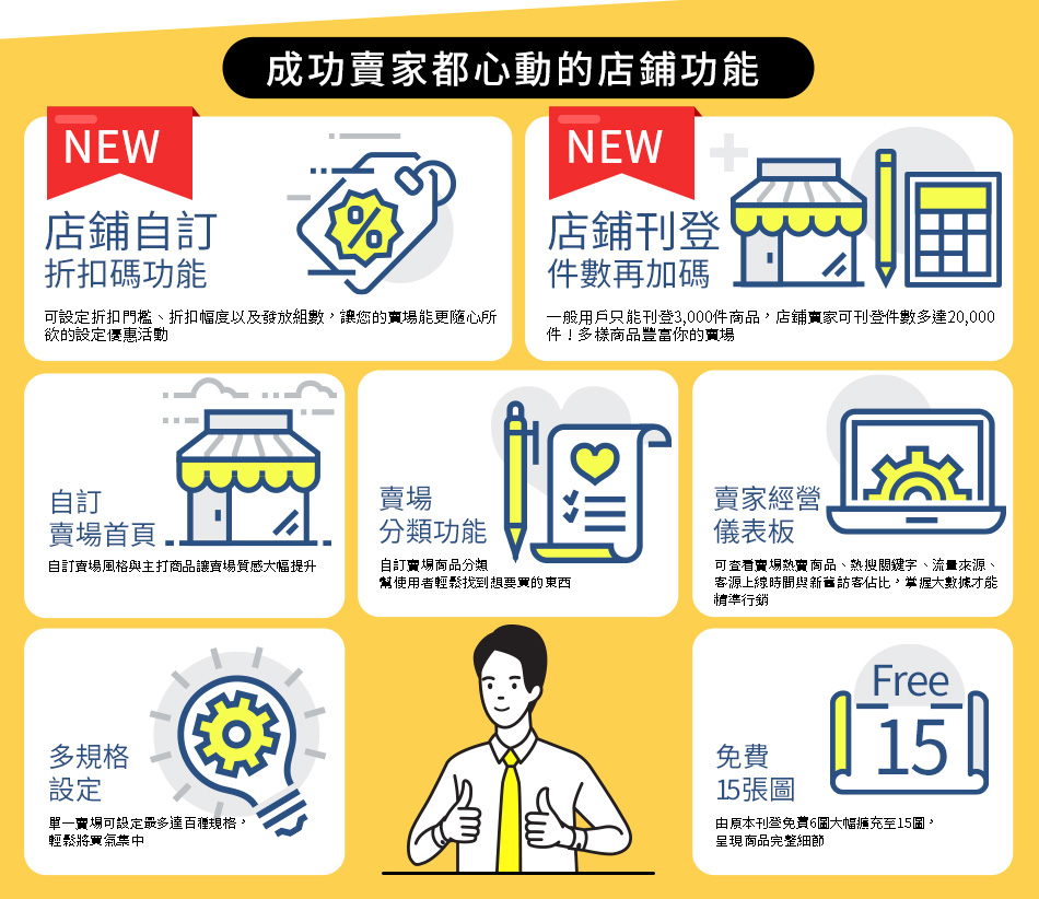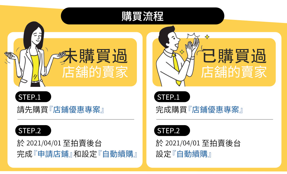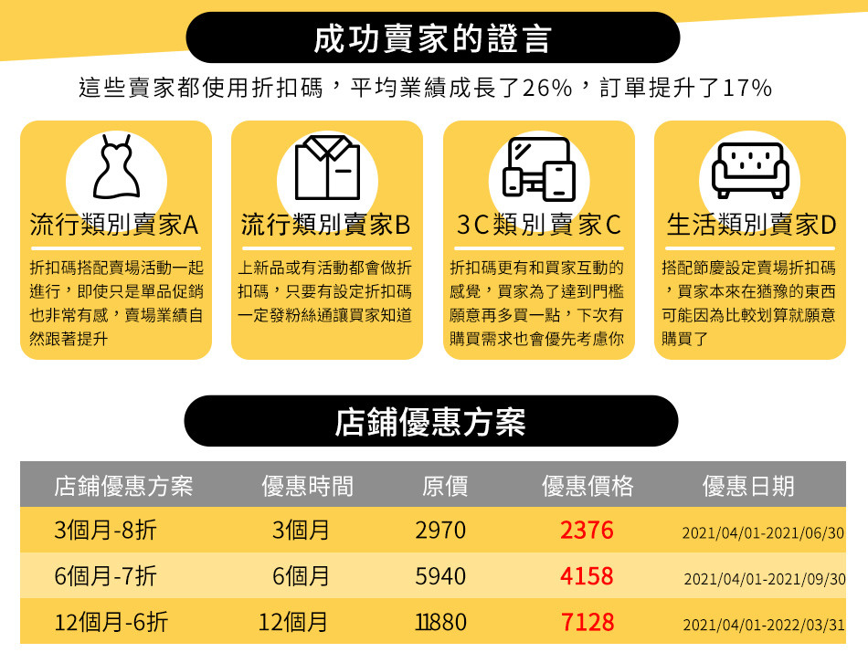 ▌本優惠活動方案固定由2021/04/01開始計算,由於店鋪優惠無法重複累計,已購買2021/01/01開始的店鋪優惠6個月/12個月方案、首購店鋪優惠的賣家敬請注意專案起始時間,以避免重複購買。