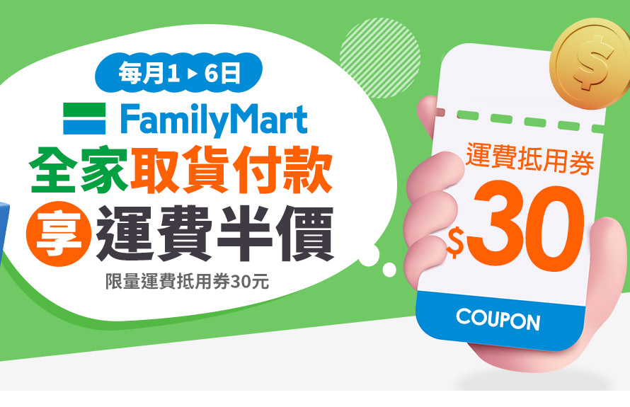 活動期間內於Yahoo拍賣(包含Web+App)下單單筆滿$99,且選擇「全家取貨付款」,並於結帳付款選擇【全家運費優惠】運費抵用券折抵成功之訂單,即享有運費折抵30元優惠。
