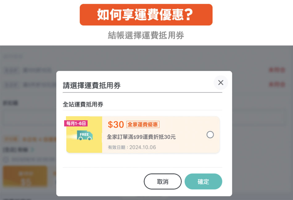 - 符合運費優惠的訂單:配送方式選擇全家取貨付款,且該筆單筆訂單金額滿99元(不包含運費),並成功使用【全家運費優惠】運費抵用券折抵運費之訂單